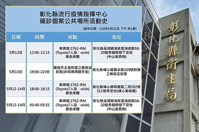 May 22, 2021 · 彰化縣衛生局22日公布最新疫調確診者足跡。(彰化縣衛生局提供/謝瓊雲彰化傳真) 彰化縣政府22日公布新增4例新冠肺炎確診者,今年累計已有73.