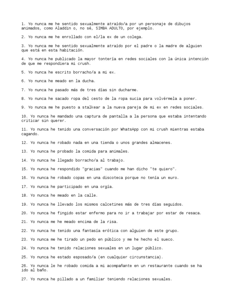 Yo nunca mentí en el yo nunca yo nunca he estornudado y me ha salido un moco yo nunca he preguntado a alguien que no trabajaba en una tienda si tenía mi talla